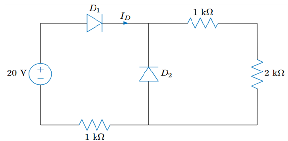 D1에 순방향 바이어스가 걸려 켜진 상태이고, D2에 역방향 바이어스가 걸려 꺼진 상태이다. 따라서 1k-2k-1k 직렬 저항에 걸리는 전압 강하는 19.3V가 되고, 전류 I_D = \frac{19.3}{4k} = 4.825mA 이므로 답은 ②이다.
