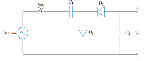위 회로는 Voltage doubler - 전압 2배 회로이다. v_{in}이 0보다 작을 때 C1이 충전되고, v_{in}이 0보다 클 때 전압원과 C1의 전압이 합성되어 출력되므로 정상상태에서 v_o의 진폭은 10V이다. 따라서 답은 ①이다.