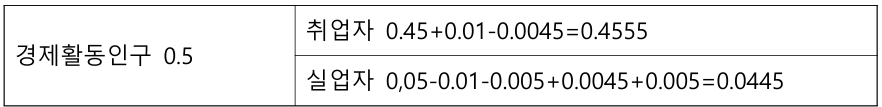실업률은 실업자/경제활동인구이므로 0.0445/(0.4555+0.0445)*100=8.9%이다. (비경제 활동인구는 고려하지 않는다)