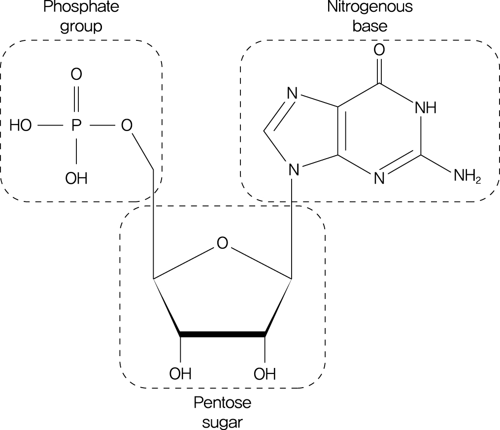 뉴클레오타이드의 구조: 인산기, 알도펜토오스 당, 헤테로고리 염기의 세 가지 구성 요소로 이루어진 복합체이다.