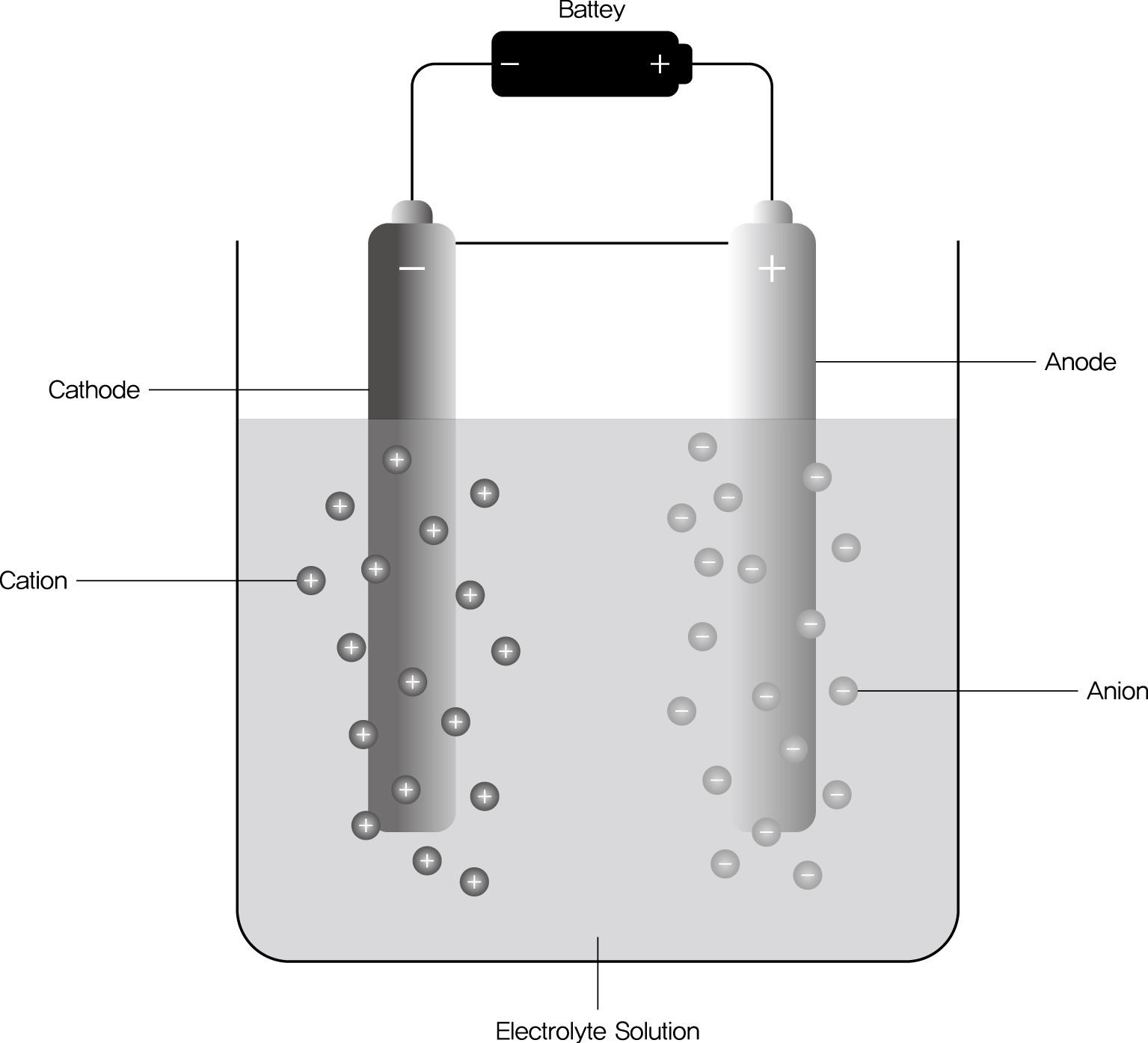 원리: 외부 전압을 인가하여 음극에서는 환원(Cathode)을, 양극에서는 산화(Anode)를 유도한다. 전기 도금(Electroplating)이나 금속의 순수화 등에 활용된다.